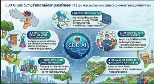 การชี้เป้าความยากจนแม่นยำในยะหา (Precision Targeting in Yaha): AI วิเคราะห์ Big Data (จปฐ., TPMAP) ในระดับตำบลและครัวเรือน เพื่อค้นหาปัญหาความจนเชิงซ้อน -> ชี้เป้าความจนเชิงซ้อน -> ตัดเสื้อให้พอตัว (Targeted Actions).
